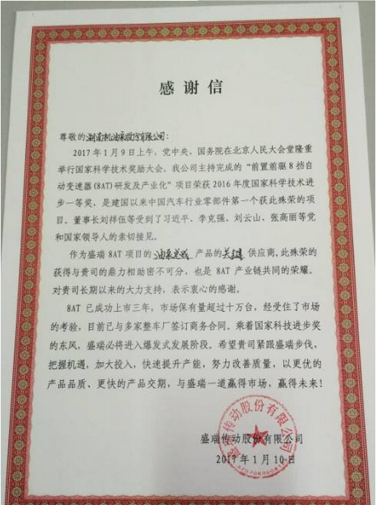 盛瑞公司感谢信